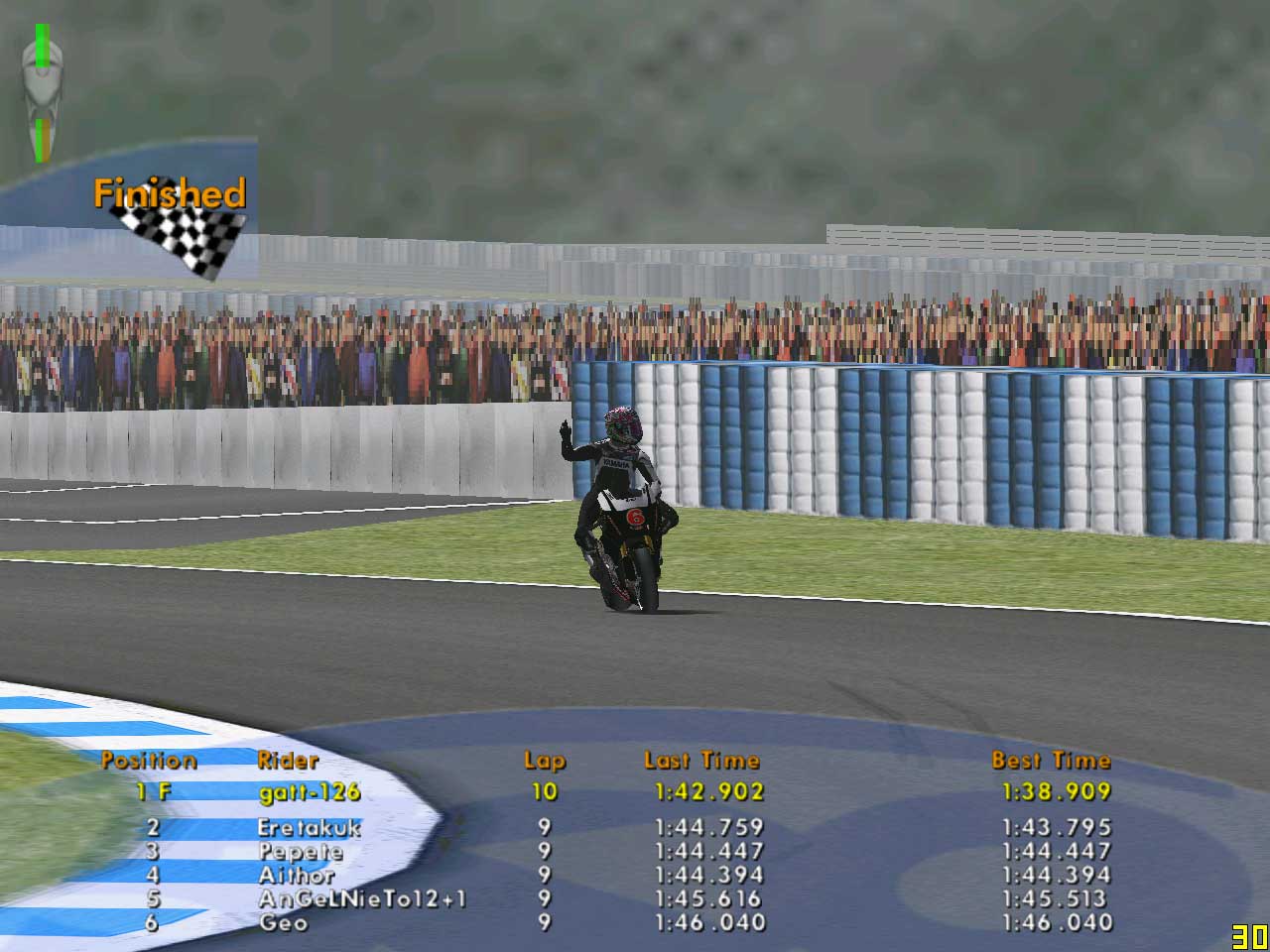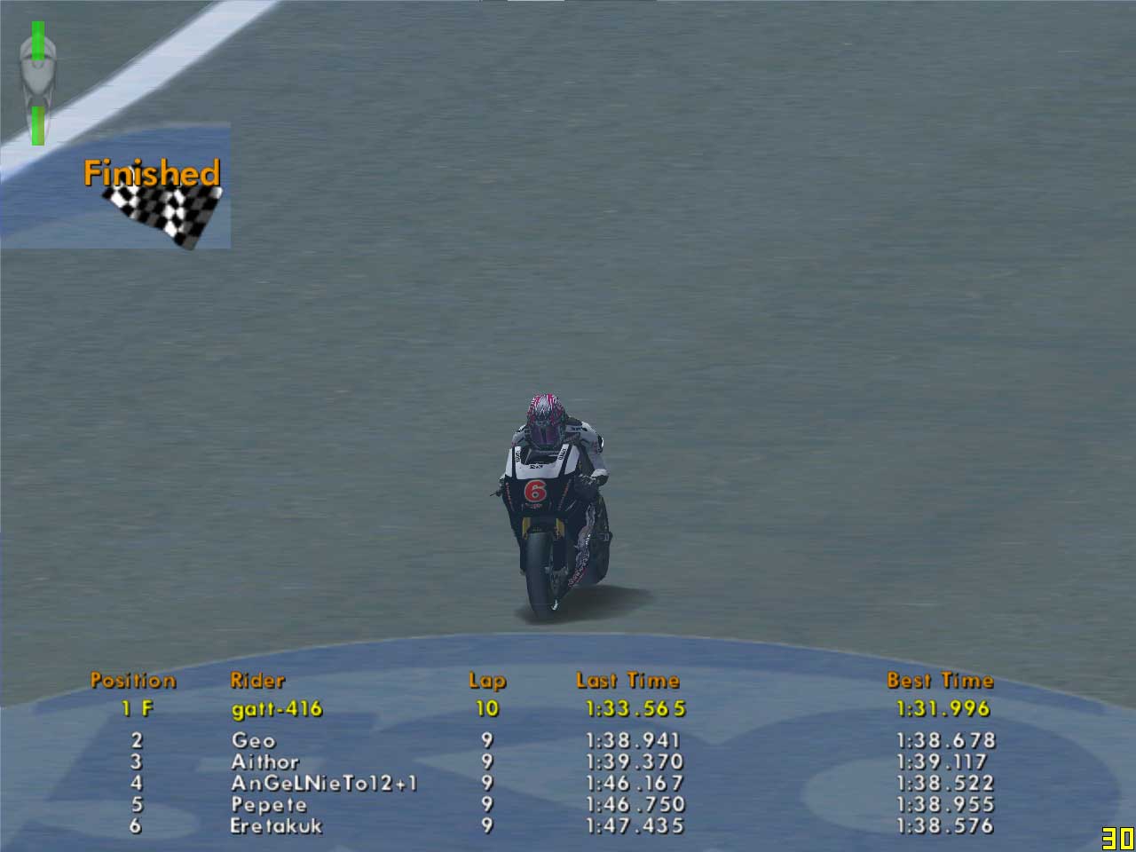 やっぱり本番は緊張するもので、手元が狂ってコースアウトしそうにもなりましたが、なんとか押さえ込んで31秒9~32秒5をキープ。タイヤがたれた残り2周で少しペースダウンして、33秒台できっちり完走しました。タイムは13分56秒664。今までの中で一番うまくいったレースでしたが、さて、結果がいかがなほどに。3連勝中のKaiser7Kさんが今回はそうそうに戦線離脱をフォーラムで明かしていて、どうも結果送信に失敗したようです。タイムは13分58秒台だったみたいなので、いつものKaiser7Kさんとのタイム差を考えると…ちょっとはいい成績になるかな? でも、自分もちゃんと送れてるか毎回心配なんですよね…。