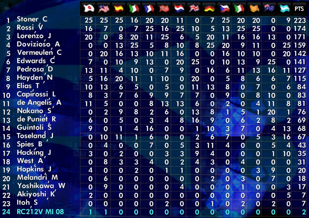 とりあえず分かったことは、去年時間をかけて車体セッティングを煮詰めたRC212V+MI、D16GP08+BS、GSV-R+BSの車体バランスがいいこと、今シーズンから登場して、あんまり煮詰めてないYZR-M1+BS、RC212V+BSの車体バランスが悪いこと。M1はコーナー進入、212V+BSはコーナー脱出で安定していないことが分かりました。この辺を改善しつつ、ロッシがチャンピオンをとれるようなRiders.datを開発しようと思います。