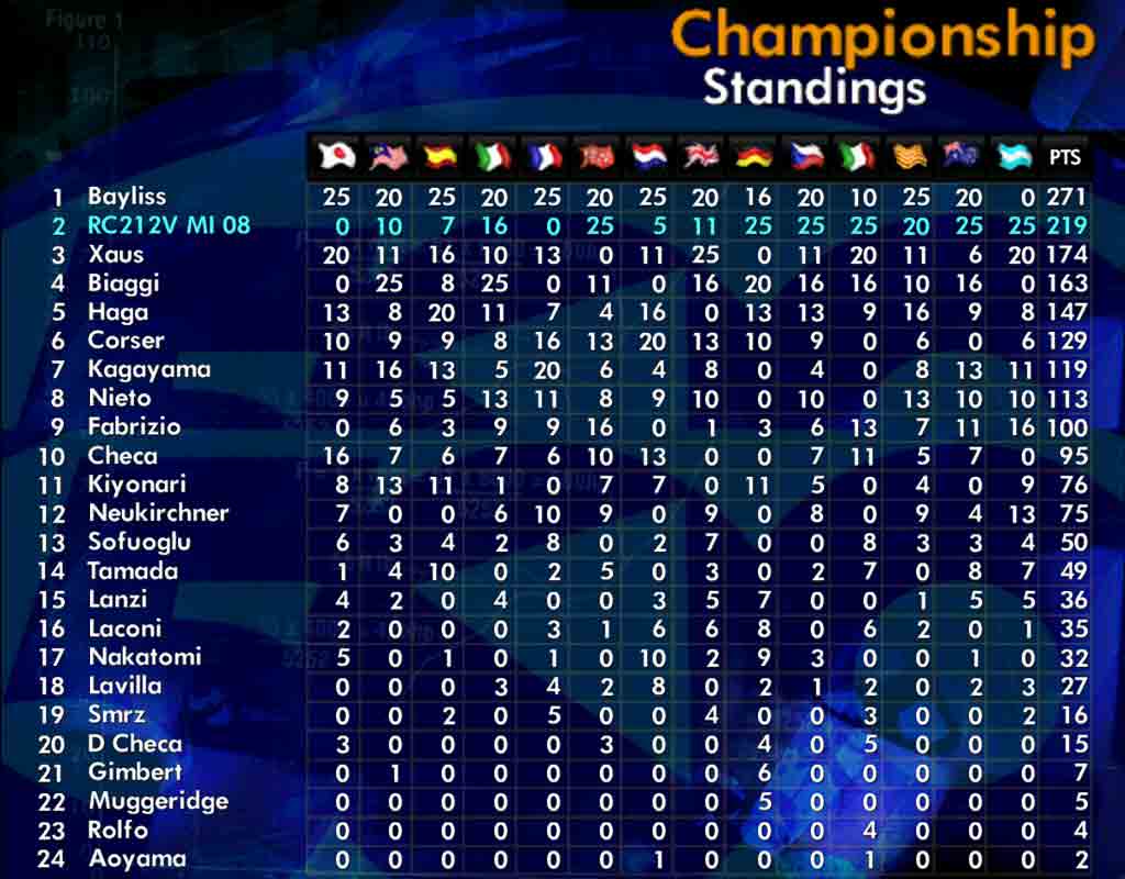 テストもしてみたけど、ムジェロで1分48秒台の中盤で周回できています。ギヤレシオも見直し、フィリップアイランドでは今年のSBKの実戦と同じ程度のトップスピードが出ています。どの車もなかなか良い感じに煮詰まってきているので、GWあたりまでには第2版がアップできるかな。