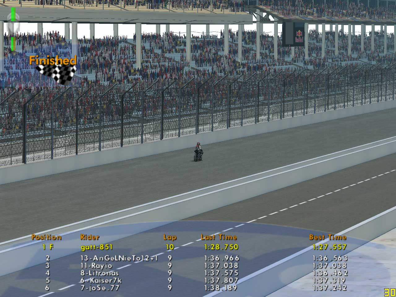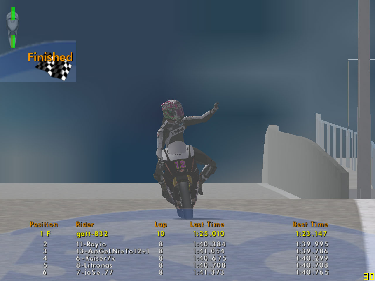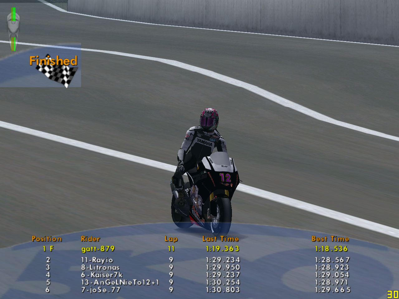 Erolさんのゴーストとバトりまくり、なんと29秒6までタイムアップ。現在トレーニングタイムではトップタイムです。ロングランでは30秒台前半をだいたいキープできるようになりました。ロングラン中に29秒台まで入れることができれば、結構いい感じになると思いますが、鍵は最初のシケインと左のヘアピンですね。ここを安定してうまく攻略できるようになれば、29秒台が狙って出せるようになると思います。もう少し練習して、タイムを縮めたいです。