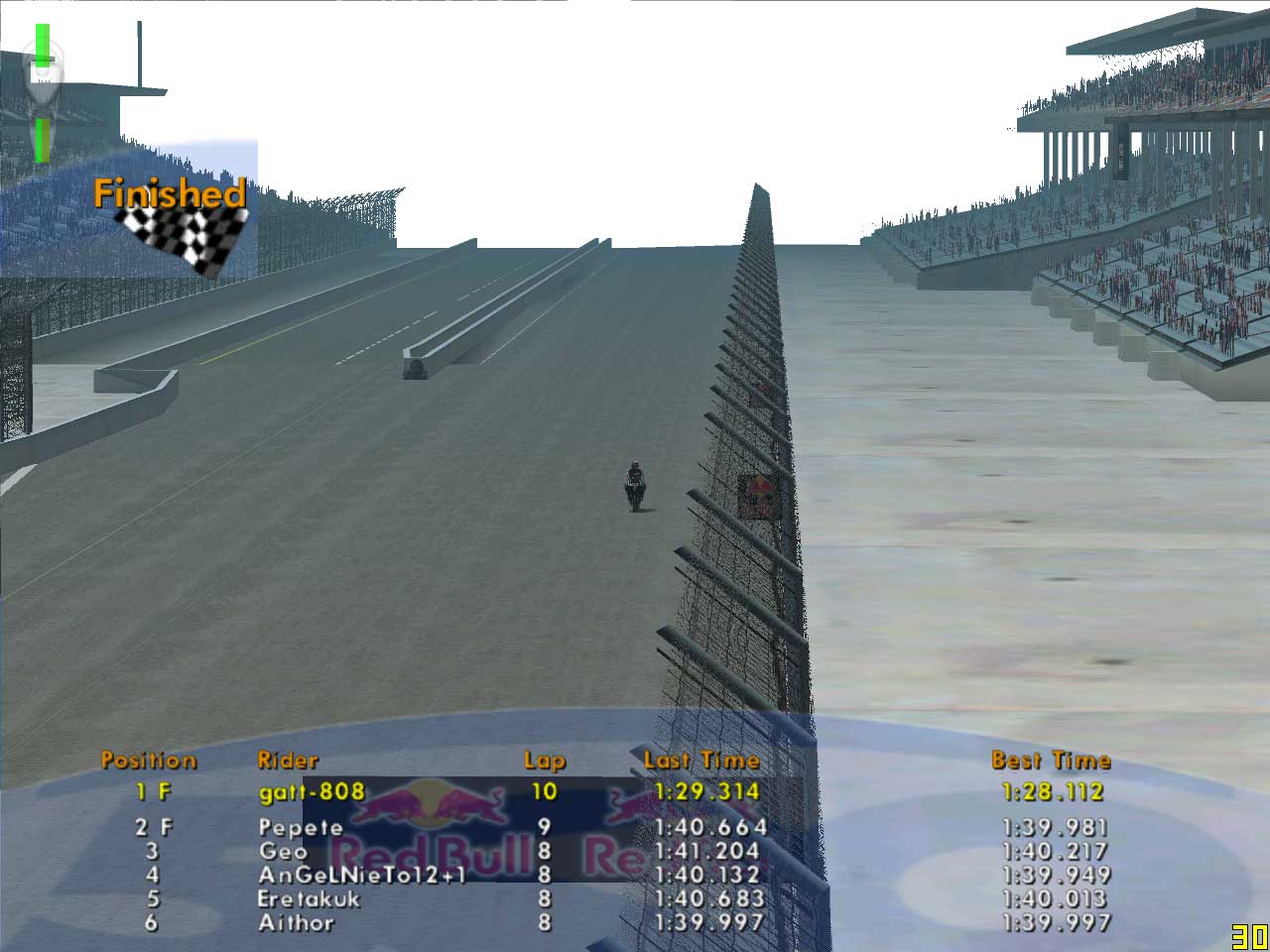 やばいですね。本当に。ミサノが嫌いになってきました。今日はおそらく10回以上は転倒。転倒地点は全部裏の左に曲がっていく高速部分です。コースアウトで転倒、縁石に乗って転倒。縁石が滑りやすくてやっかいなので、なかなかイン側ギリギリまで攻めることが出来ません。縁石がこんなに滑らなければ、もう少し気分よく走れそうなのに。