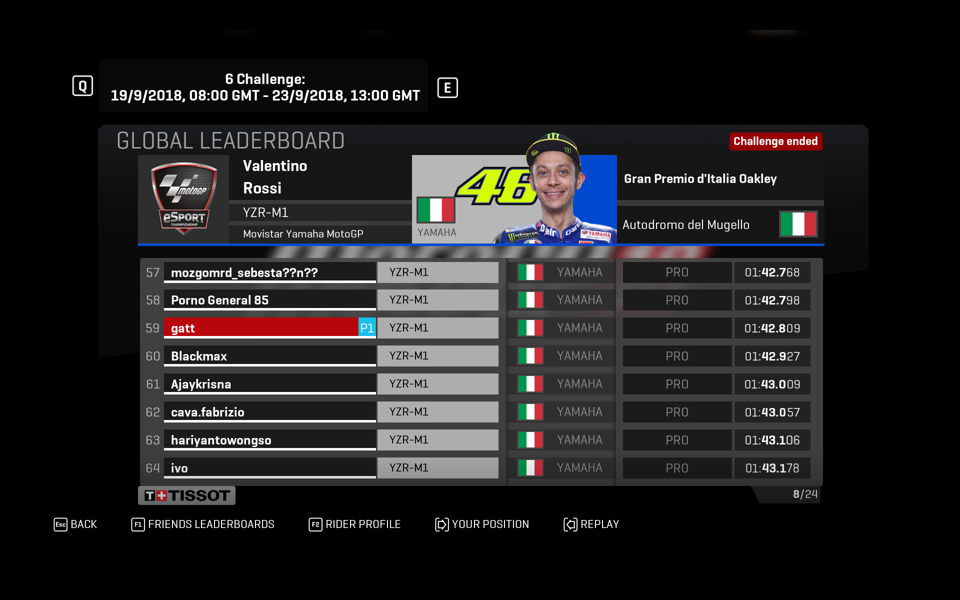 MotoGP18を購入したのはムジェロラウンド締め切り3日前。最初は操作性に苦しみ、1分50秒が切れない。そこから毎日練習して、なんとか1分42秒台まで持って行き、59位。アナログ入力は苦手だし、こんなものかな。